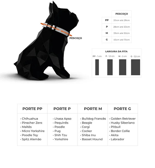 - Tamanho P: 1,5 cm de largura, ajuste de 28 até 40 cm.