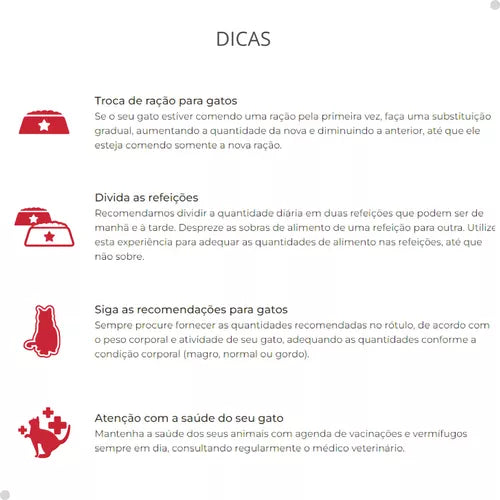 • Uma alimentação balanceada é essencial para que o seu fiel companheiro se mantenha saudável e forte. A dieta do seu gato é refletida na sua pelagem, por isso é de vital importância que contenha todos os nutrientes necessários para o seu crescimento. Garanta a energia e a vitalidade do seu amigo para que ele possa correr, pular e jogar o dia todo.